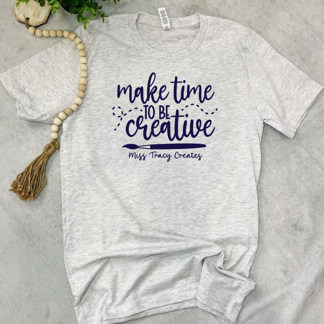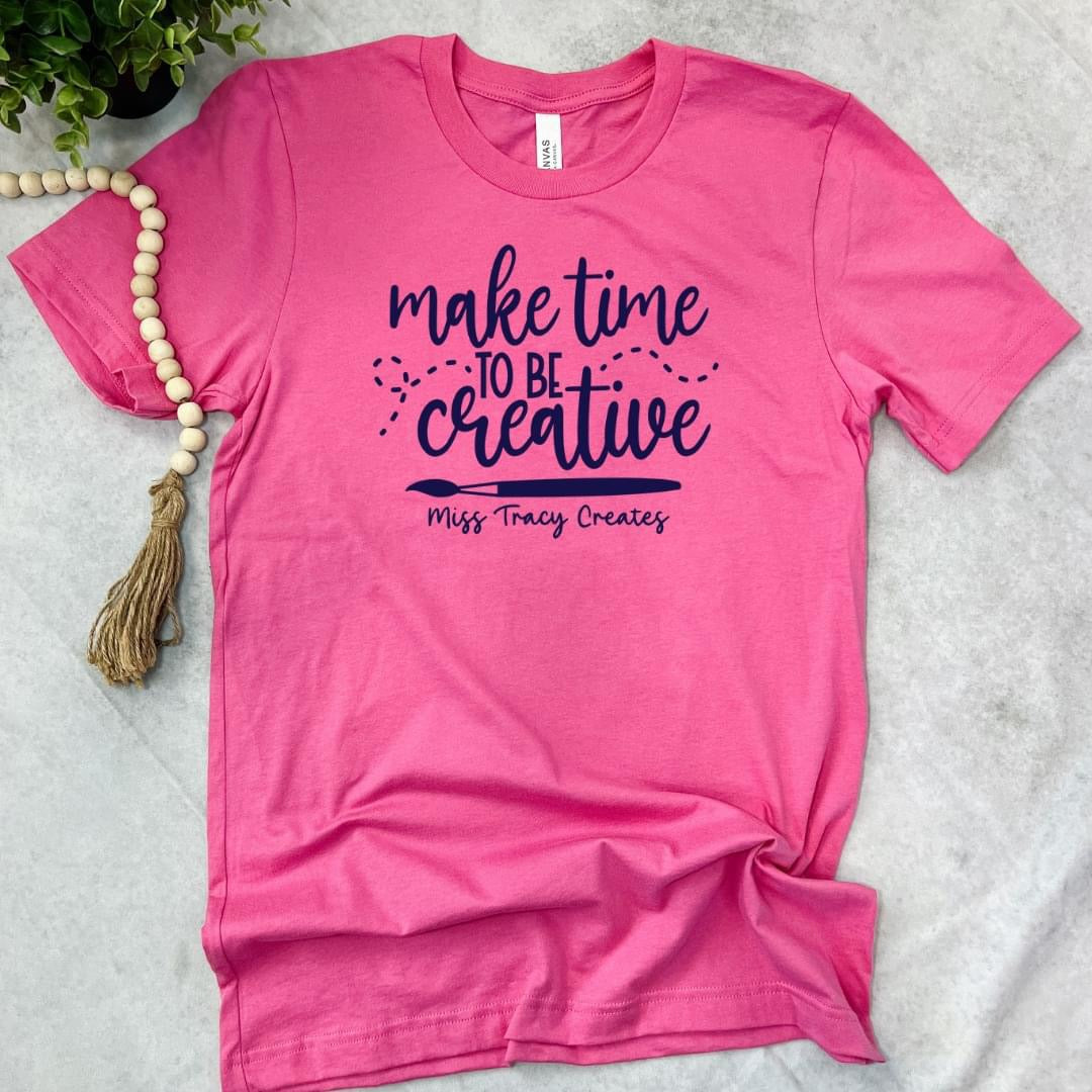 "Make Time to be Creative" T-shirt - design printed: navy screen on the most comfortable Bella Canvas short sleeve tee. T-shirts are available in the following Colors: Pink, Teal, Mint, Ash. Unisex Fit sizes from Small - 4X, runs true to size (see size chart for more details) Non-refundable: All Sales are Final.
